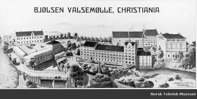 Brevhode fra 1909 som gir et perspektivforvrengt med riktig inntrykk av anlegget.I 1885 kjøpte firmaet Bjølsen Mølle, hvor det ble drevet moderne mølledrift med bruk av valsestoler. Nye utvidelser bidro til at Bjølsen Valsemølle raskt ble et av de store mølleanleggene i Norge. I 1889 ble Sandaker Mølle kjøpt, og noen år senere flyttet virksomheten fra Bjølsen og over til Sandakersiden av elva. Rettigheter til fallene i elva og utnyttelse av vannkraften var viktig. For å tilegne seg fallrettigheter kjøpte Bjølsen Valsemølle opp Christiania Mek. Væveri i 1899.