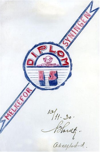 Første skisse til logo, 1930En mer profesjonell satsing på merkevarebygging og markedsføring var det tydeligste resultatet. Melkeforsyningen registrerte Diplom-Is som varemerke for sin iskrem etter at meieriets A. Hardt kom med forslag til logo, og foreslo navnet Diplom-Is med følgende begrunnelse: "Diplom-Is gir uttrykk for noe virkelig fint, og det er jo ikke umulig at man på en meieriutstilling kan bli tildelt et diplom." I 1930 kom også den aller første Diplom-Is-annonsen ut.