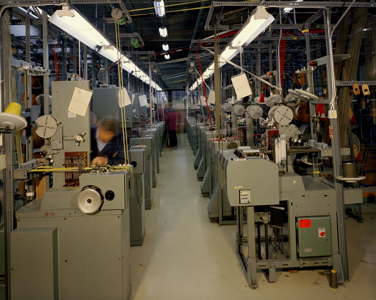 Varpesalen på loftet, ca 1914. Foto: NTM"Lidsefarbikken" produserte alle slags bånd i rayon, bomull og nylon, strikk i forskjellige utførelser, sko- og støvlelisser, seler, sokkeholdere, ermholdere, elastiske herrebelter, korsettstropper, skulderstropper, roll-ons, sytråd til hjemmesøm og til konfeksjon. Til industrien leverte firmaet teknsike bånd og snorer som spindelsnor og isolasjonsbånd.