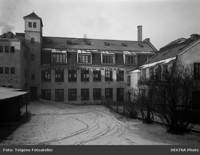 Skofabrikken Norge i Teglverksgata i 1951. Foto: Oslo ByarkivFabrikkens dispopnent var Jens Andersen, som ledet oppbyggingen av fabrikken fra 1911. Fabrikkbygningen i Teglverksgaten ble overtatt fra et konkursbo etter Smørfabrikken Mercur i 1914 for kr. 30 000.