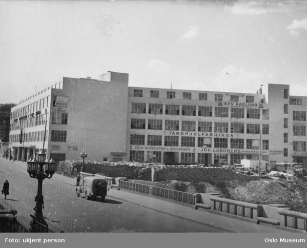Peter Petersens gård ved Sannerbrua, med bl.a. Tandhjulfabriken i den ene fløyen. OB.F22593 (Rettigheter: Oslo Museum)